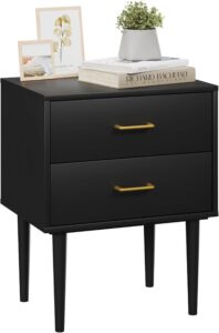 – The black bedside table features gold hardware, adding a touch of elegance and sophistication. Its dark color contrasts with the lighter elements in the room, grounding the space.