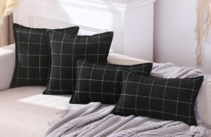 – The black plaid pillow contrasts sharply with the others, adding visual interest and tying into the darker elements like the bedside table.