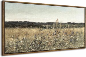 – The artwork above the bed depicts a serene landscape with trees and natural scenery in muted colors, echoing the room’s earth tones. The wooden frame adds warmth and ties the artwork into the room’s overall aesthetic.